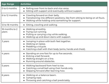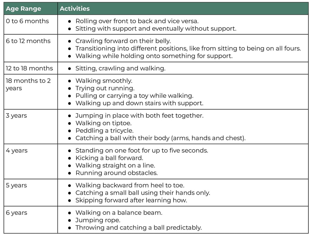 Gross motor skills are the larger movements children make using the big muscles in their arms, legs, and torso. These skills help them do activities like sitting, standing, walking, running, jumping, and keeping their balance. Below is taken from the Cleveland Clinic's guide to Gross Motor Skill Milestones for Children. While these skills will continue to develop after the age of 6, children develop at their own pace. If you have concerns about your child's progress, please seek a professional's assessment.